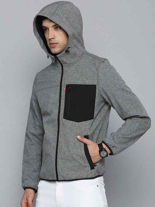 Upgrade your casual wear collection by opting for this trendy Levi's Men Hooded Neck Jacket. The solid pattern of this grey jacket makes it a must-have. Made from durable softshell material, this full sleeves jacket features a comfy regular fit.