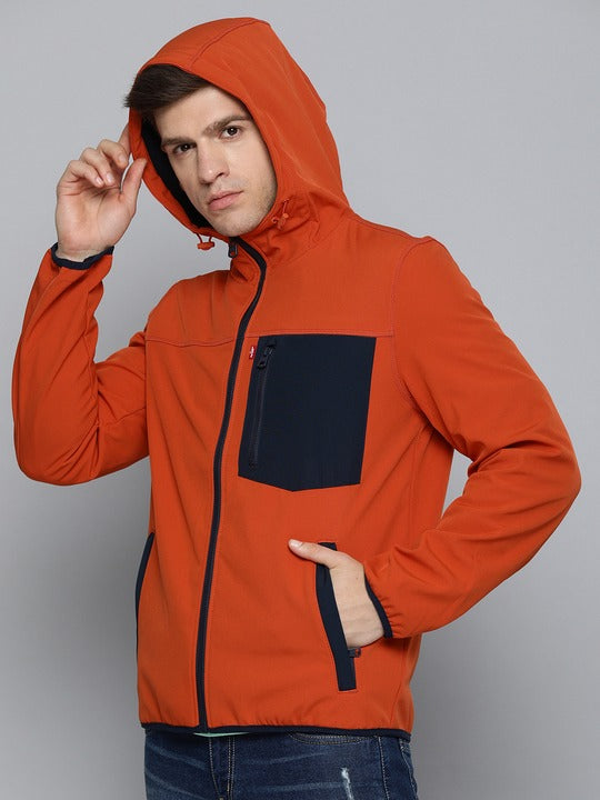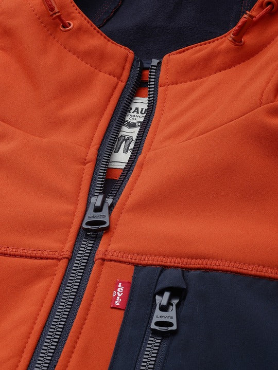 Make a cool fashion statement by donning the trendy and versatile Levi's Men Hooded Neck Jacket. This blue jacket features a understated solid pattern. This full sleeves jacket is made from softshell material and boasts a regular fit.