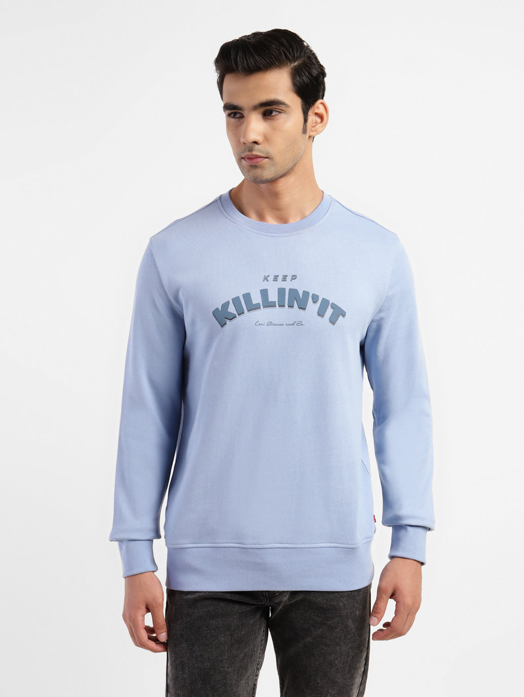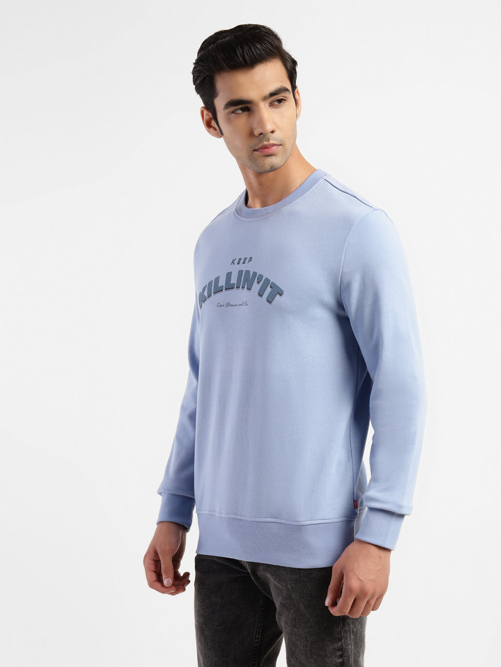 Make heads turn everywhere you go when you don the trendy Levi's®Men's Crew Neck Sweatshirt. It features a distinctive graphic pattern and is designed in a blue hue. Made from soft cotton material, this crew neck sweatshirt features full sleeves.