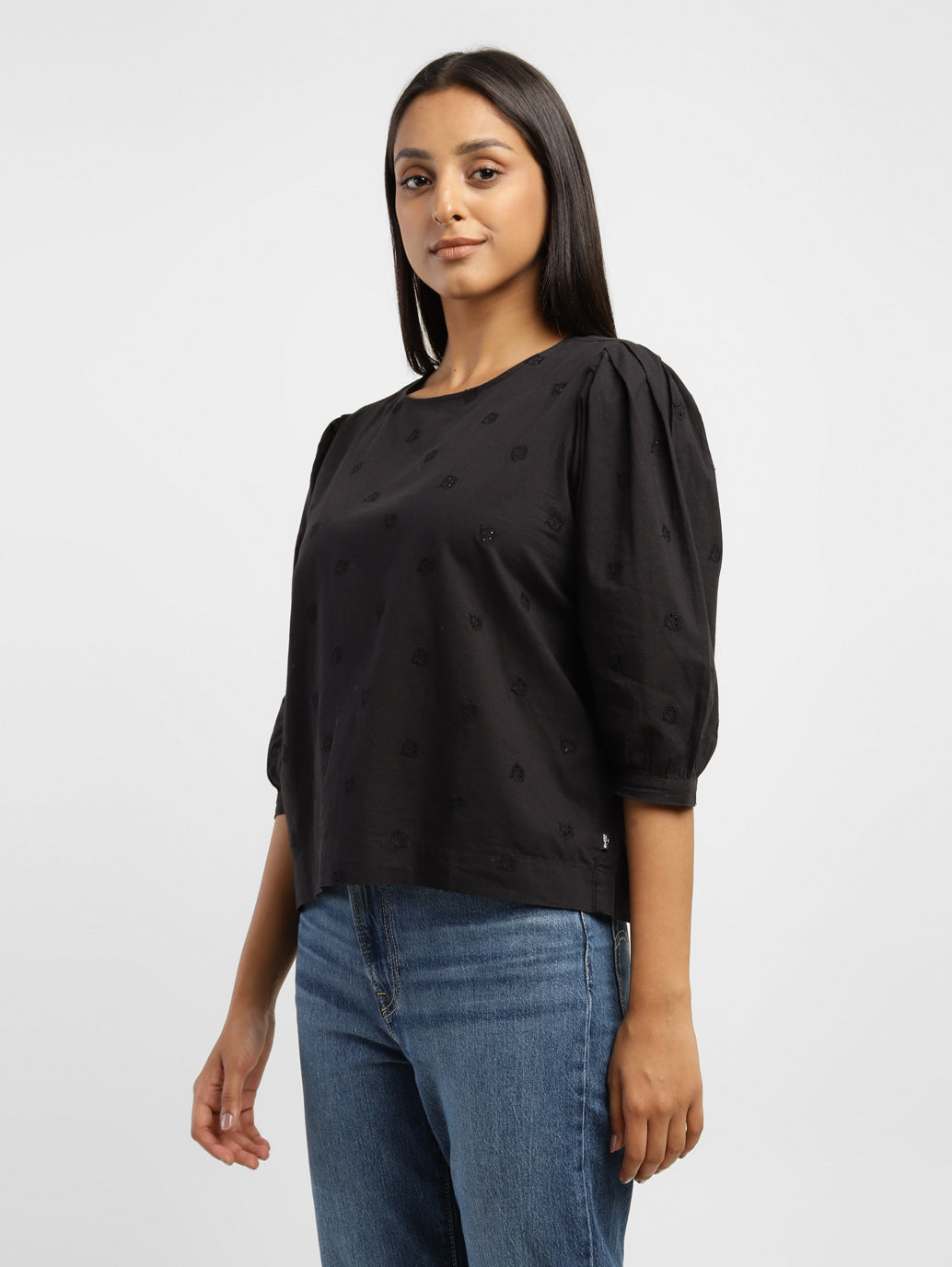 Smart and classy, the Levi's®Women's Round Neck Top makes for a chic addition to your closet. Boasting a lovely self pattern, this black hue top will match your favourite pair of bottoms. Crafted from cotton material, it features a round neck and 3/4th sleeves.