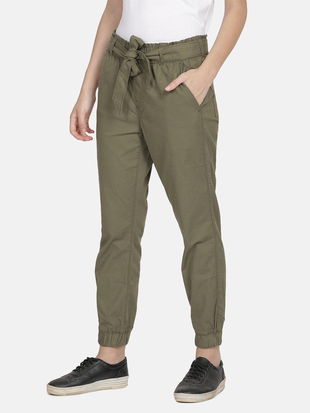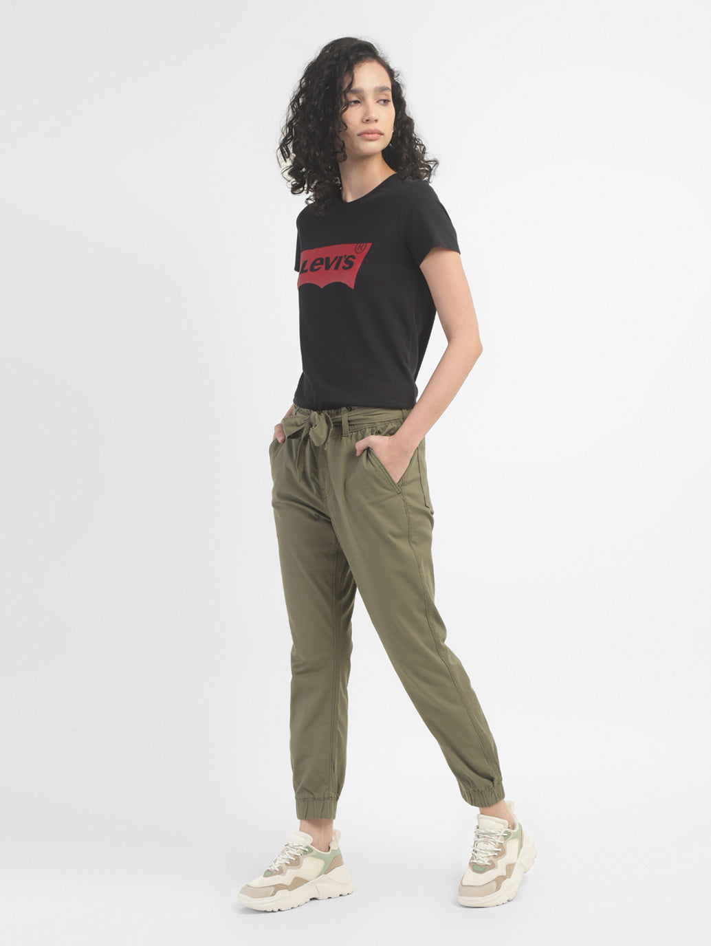 Flaunt your relaxed vibe by wearing these smart and versatile Levi's®Women's Joggers. They feature a solid pattern and are designed in an eye-catching olive hue. Made from cotton blend material, these joggers promise to lend you the desired fit.