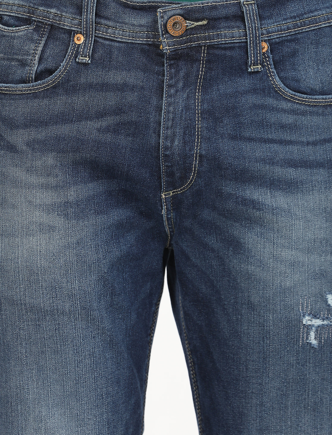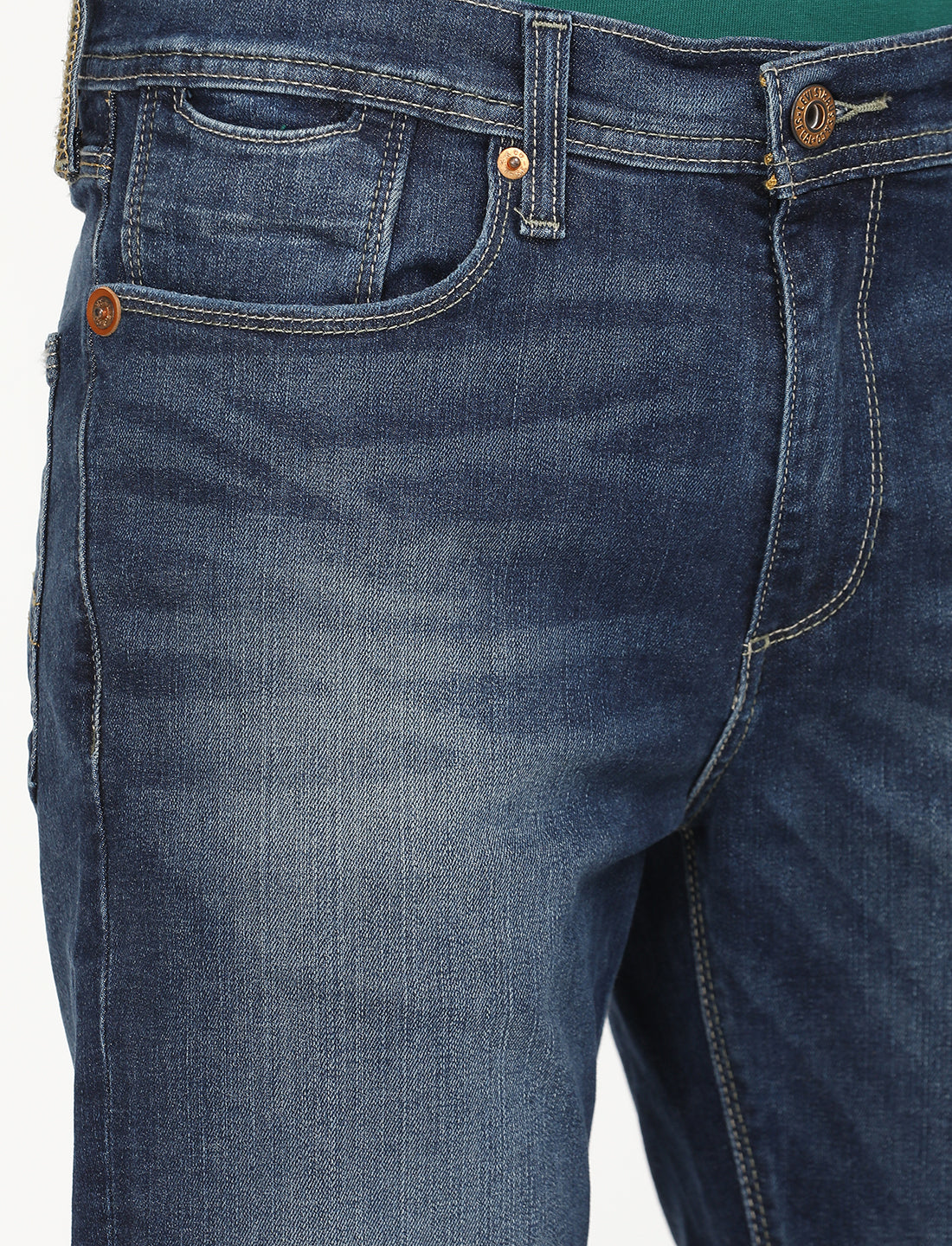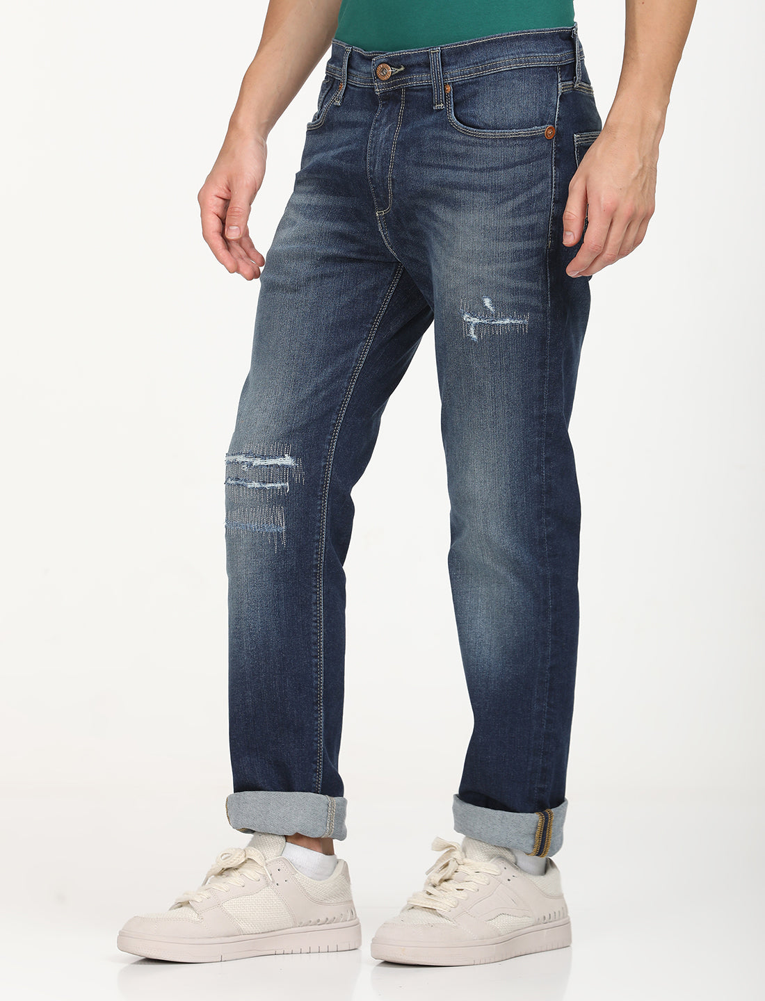 1. These jeans sit at waist with a slim fit from hip to ankle.