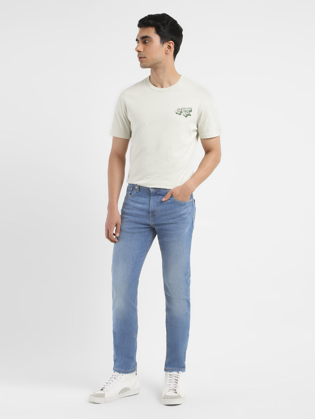 Everything you like about 512 slim, but updated with a narrow fit through the thigh and tapered leg for the fashion-forward guy. It's perfect for the modern look right now. This pair has just the right amount of stretch for all-day comfort and comes in a indigo hue with the classic 5 pocket and a cotton material. Style it with our classic shirts and a pair of sneakers to complete your casual look.