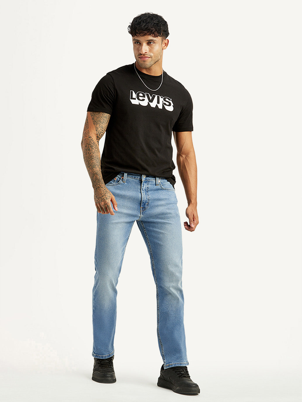 Iconic Style has met comfort. A fit that's not too baggy/relaxed and not too slim. The Levis 513 Slim tapered fit is versatile and gives a streamlined silhouette. Wear them with a t-shirt or buttoned shirt, either would work. These blue jeans with a light shade are made of cotton and will stay durable providing exceptional ease of movement and wearing comfort.