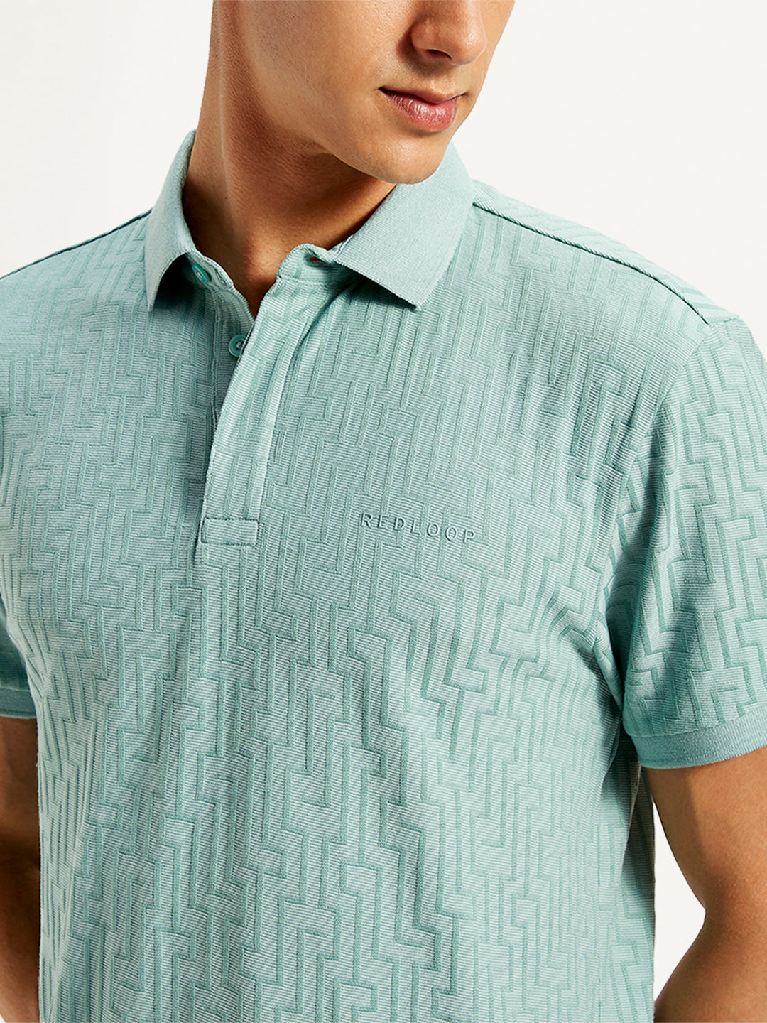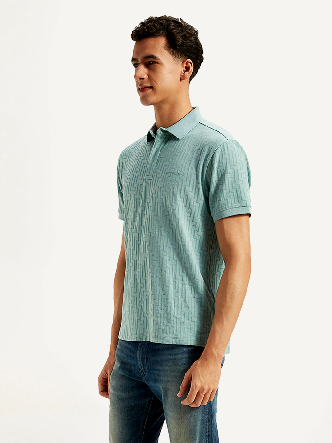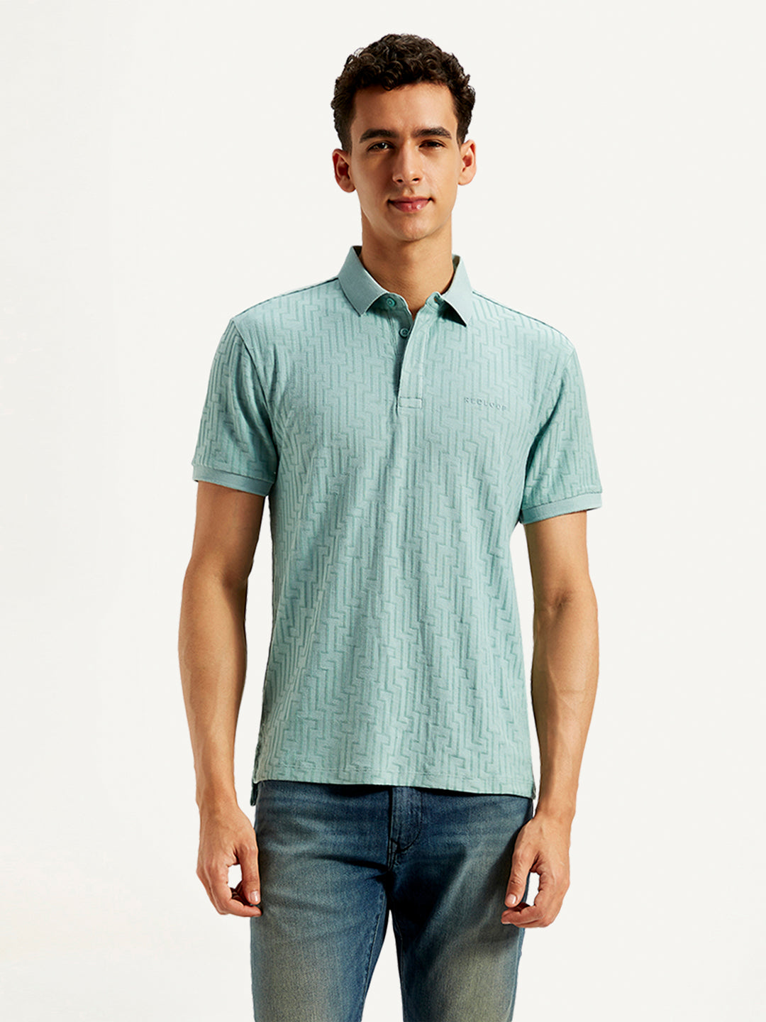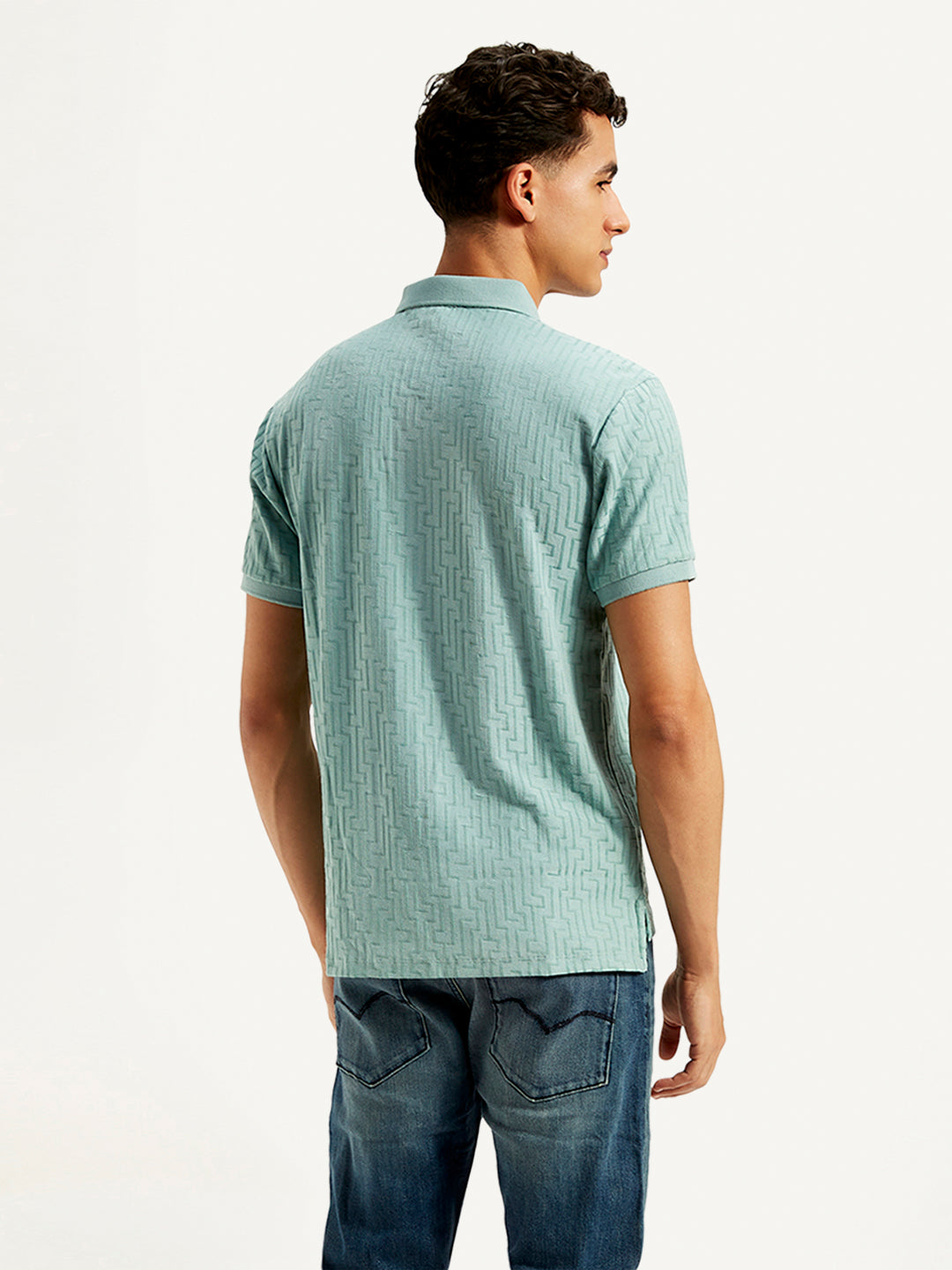 Blending style with comfort, check out this off-duty essential by Levi's. This t-shirt features a geometric pattern and comes in the color green. Classic polo collar neck and half sleeves.
