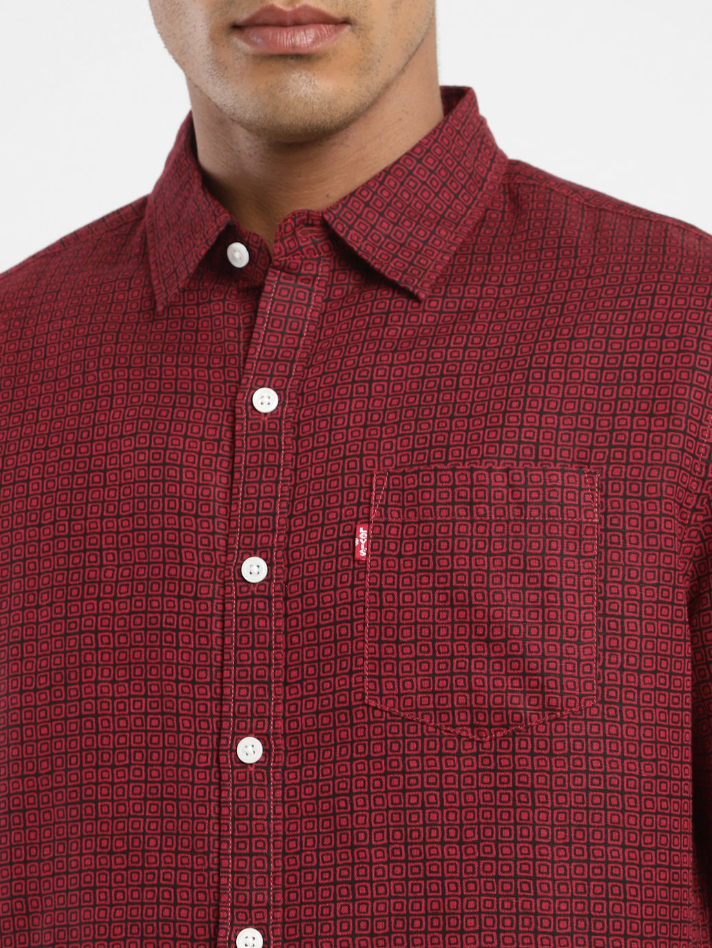 Take your style to new heights of comfort with Levi's. A casual workwear and weekend favorite, this red shirt is made of durable blended fabric and features a geometric pattern. The easy-to-wear collar and details add a laidback edge to this everyday essential.
