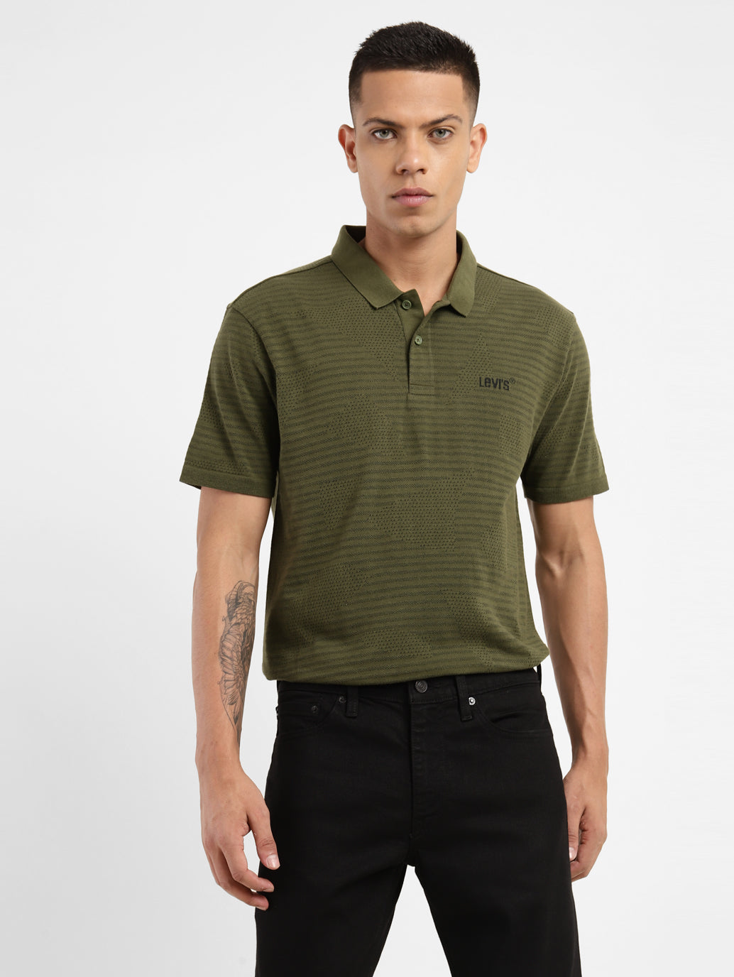 Blending style with comfort, check out this off-duty essential by Levi's. This t-shirt features a self pattern and comes in the color cypress green. Team it with a pair of denim shorts and espadrilles for a weekend get-away look.