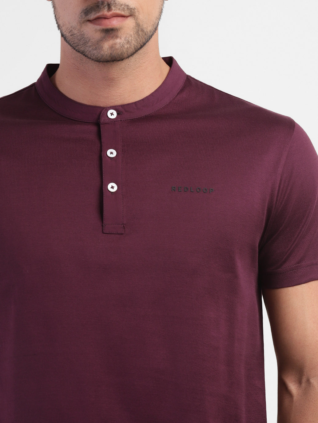 - Features a henley neck and short sleeves