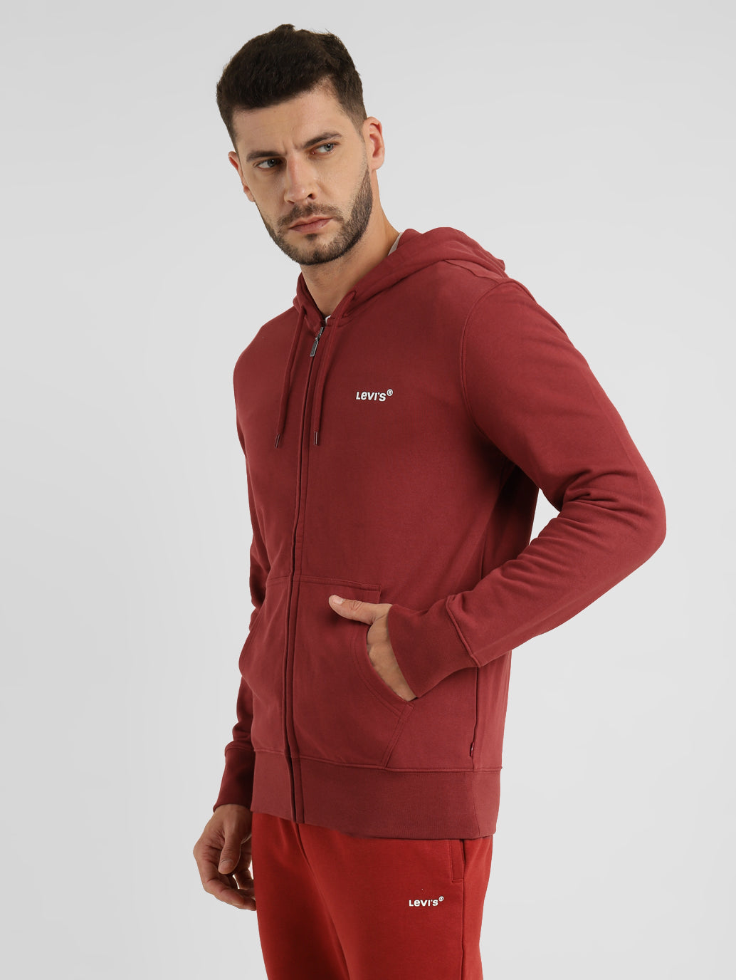 Flaunt your effortless casual style when you don the trendy and versatile Levi's®Men's Hooded Sweatshirt. This red colour sweatshirt features a distinctive solid pattern. Tailored with a hooded neck, thisfull sleeves cotton sweatshirt is a must-have.