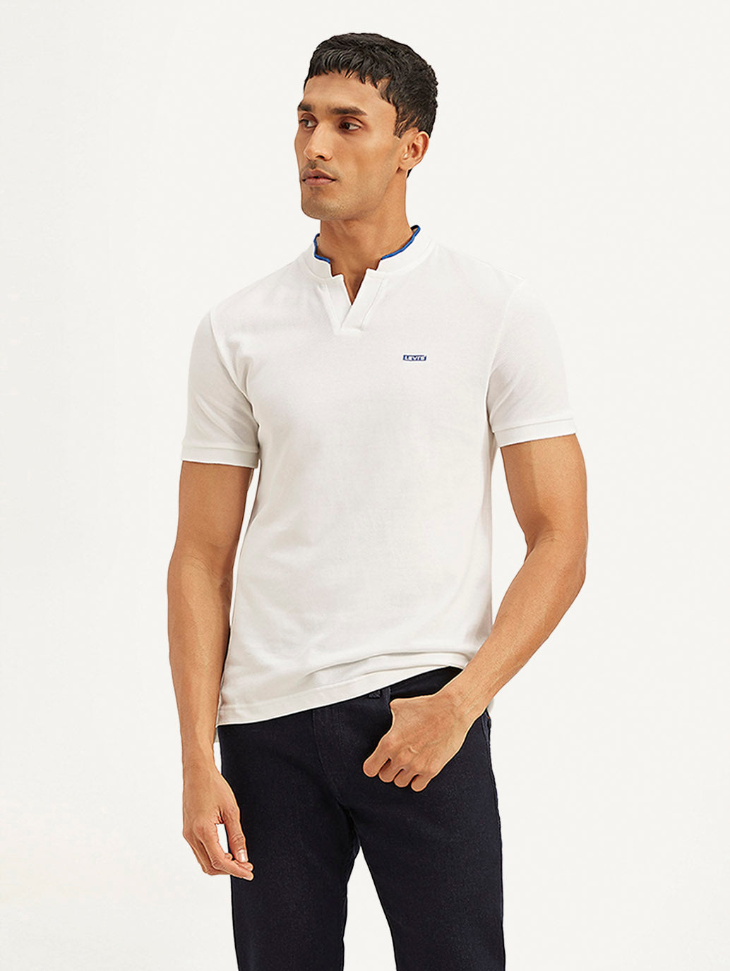 Blending style with comfort, check out this off-duty essential by Levi's. This t-shirt features a solid pattern and comes in the color white. Classic mandarin collar neck and half sleeves.