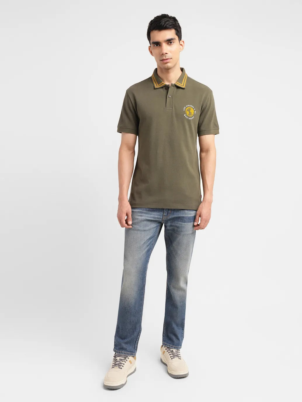 This t-shirt designed by Levi's is an easy and comfortable piece to add to your wardrobe. Lightweight and durable, it features a solid pattern and comes in the color green. Get ready for the weekend in style and pair this t-shirt with a bomber jacket and white sneakers. 1. Features a polo collar and short sleeves 2. Cut from premium quality pure cotton 3. Slim fit comes with simple details.