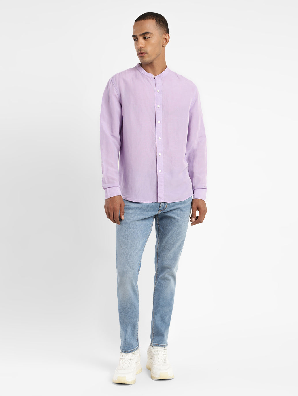 A slim fit, full sleeves, and a classic mandarin collar make this purple shirt by Levi's, a staple. The blended fabric is super soft for everyday wear and looks great with jeans and boat shoes for a'Friday Casuals'at the office.