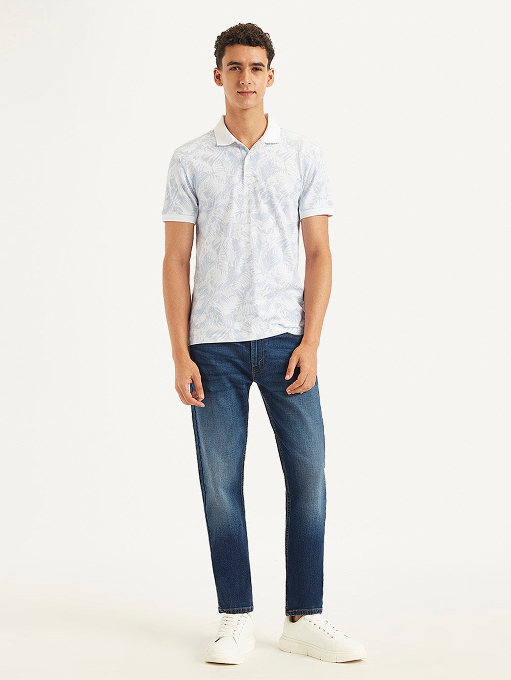 Blending style with comfort, check out this off duty essential by Levi's. This t-shirt features a tropical pattern and comes in the color white. Classic polo collar neck and half sleeves.