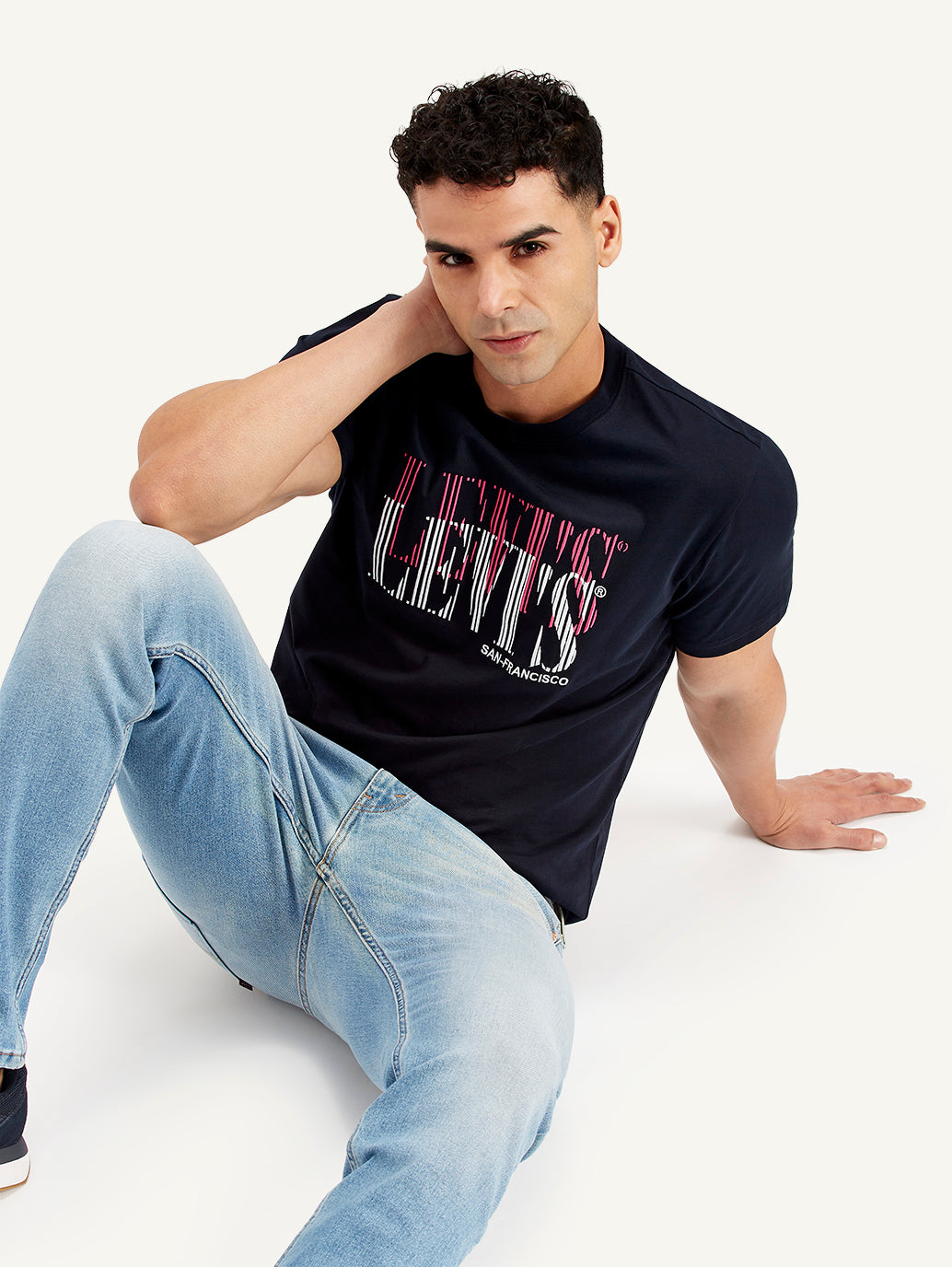 Blending style with comfort, check out this off duty essential by Levi's. This t-shirt features a typography pattern and comes in the color navy. Classic crew neck and short sleeves.