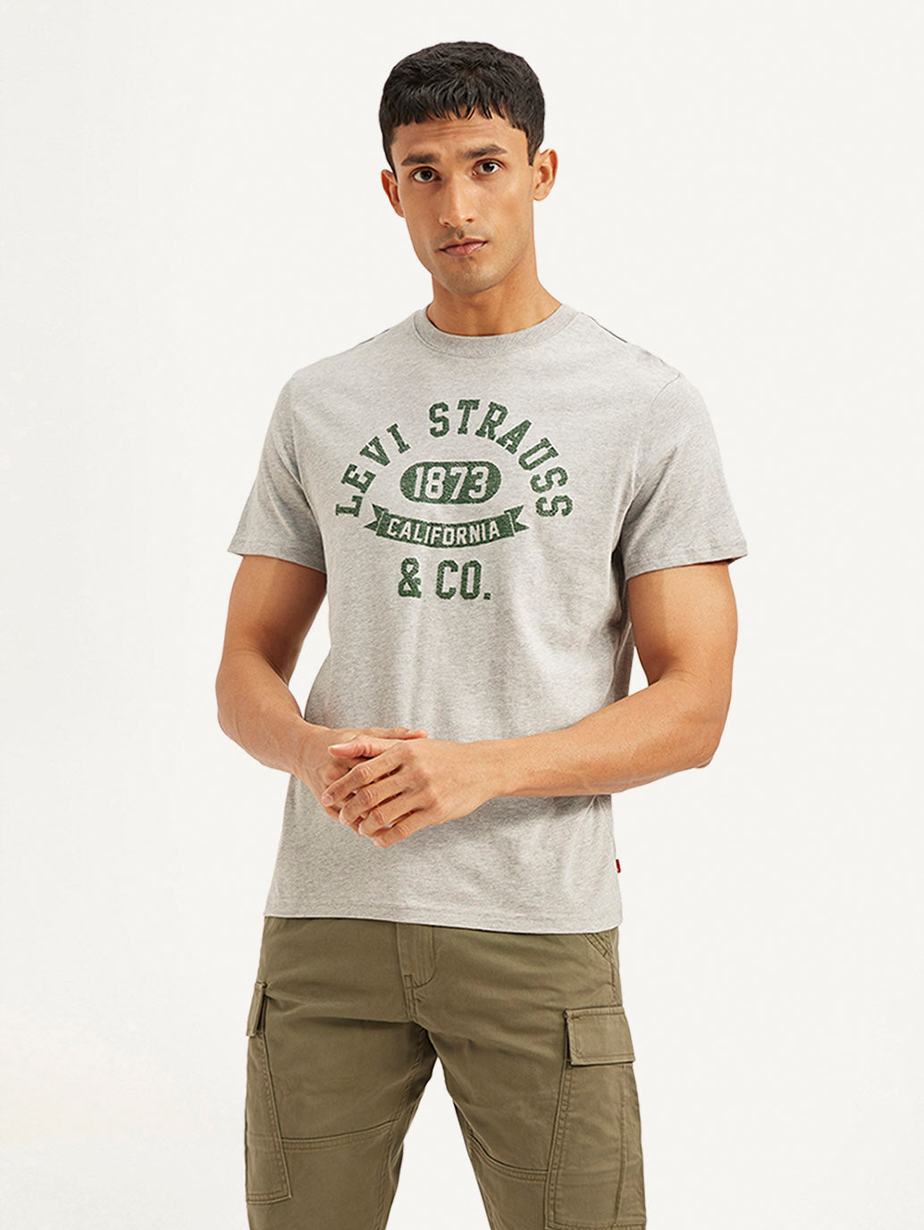 Blending style with comfort, check out this off-duty essential by Levi's. This t-shirt features a typography pattern and comes in the color grey. Classic crew neck and half sleeves.