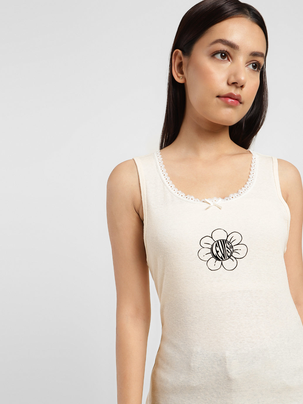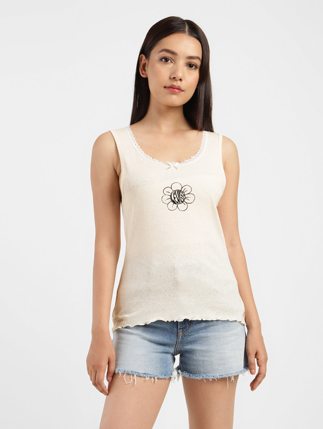 Inspired by one of the first knitwear pieces we made in the early 1900s, Levi's Dry Goods was first resurrected in the late'90s—and now, it's back again. Meet the Graphic Dry Goods Tank: with just the right amount of detail—like a lettuce edge hem, lace trim, flower graphic and a tiny bow—this simple-yet -feminine knit is easily paired with your Levi's jeans for a truly iconic look. More than 140 years after inventing the blue jean, one thing is clear: Levi's clothes are loved by the people who wear them - from presidents to movie stars, farmers to fashion icons, entrepreneurs to everyman.'Live in Levi's'asserts with confidence and pride that Levi's clothes are indeed for everybody who's not just anybody.