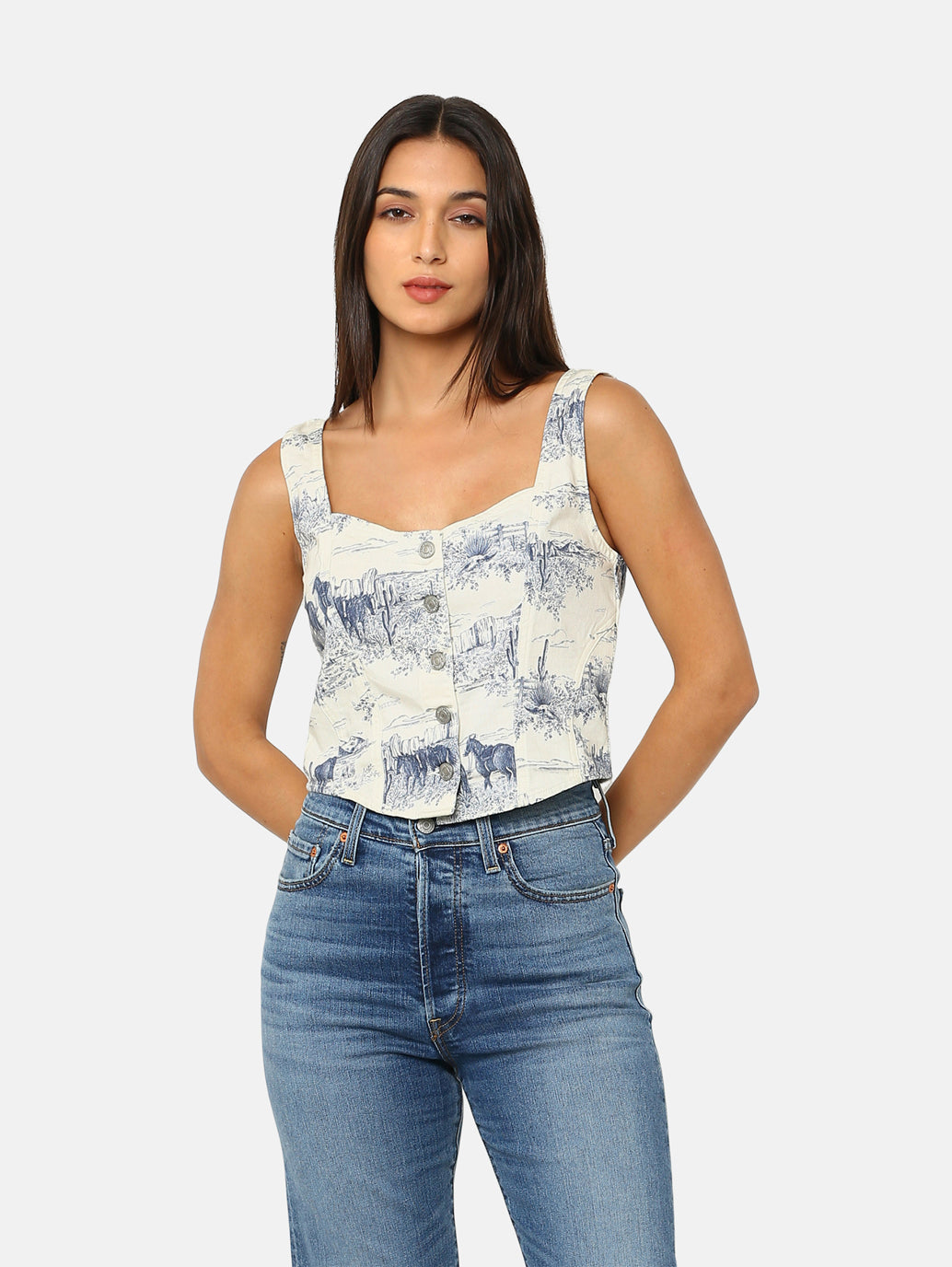 This white graphic pattern top from Levi's, seems like it was designed to find a space in your 'weekend-only' casual wardrobe this season. Made from good-quality pure cotton fabric, this top is cut in a slim fit. Tuck this top into a pair of high-waisted flared jeans for a look you can put together in seconds!