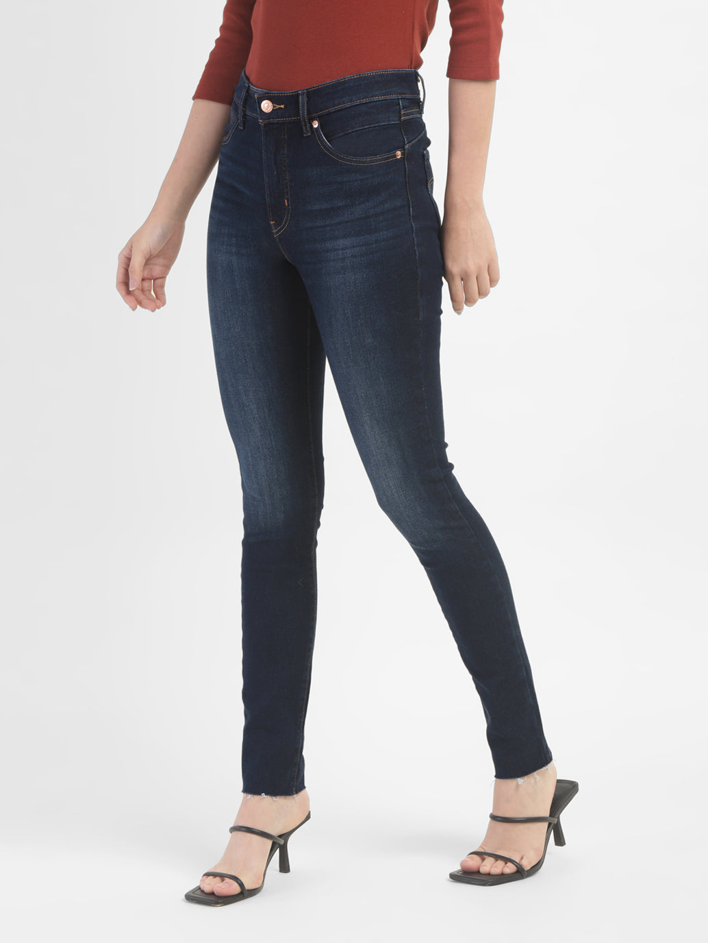 - Skinny fit; Sits at high rise