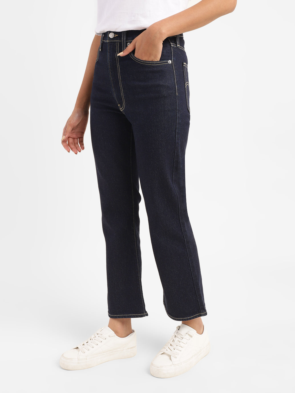 With a figure-flattering high rise silhouette and plenty of adaptable pockets, Levi's improves denim style! These ribcage crop boot blue jeans feature button & zip at the front and a flattering waistband. The bootcut style is just right for going out or staying in!