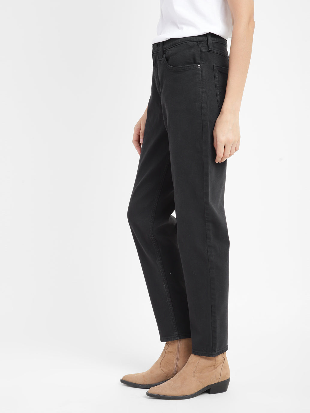 A wardrobe staple, these Levi's Women's Tapered Fit Jeans are a stylish pick for everyday wear. This pair of black jeans features a solid pattern for an edgy look. Made from durable cotton, these tapered fit jeans are a must-have.