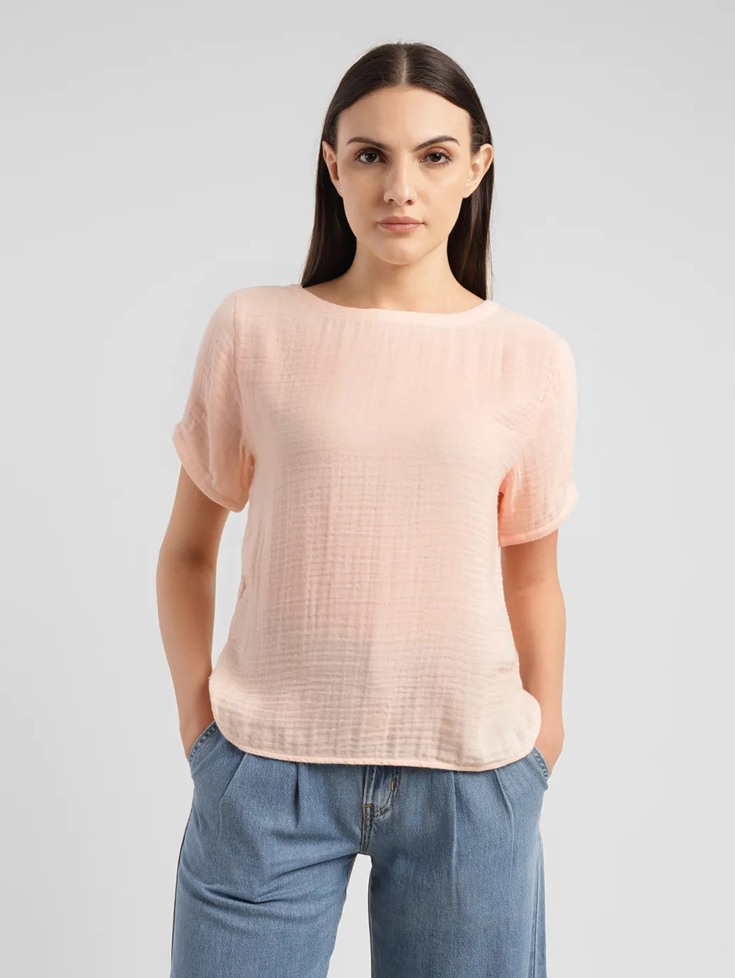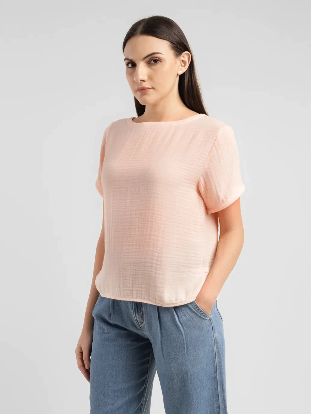 This peach textured pattern top from Levi's, seems like it was designed to find a space in your 'weekend-only' casual wardrobe this season. Made from good-quality cotton blend fabric, this top is cut in a regular fit. Tuck this top into a pair of high-waisted flared jeans for a look you can put together in seconds!